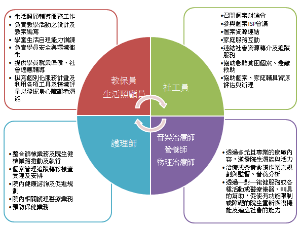 本院聘任各領域專業人員,提供院生各面向整合性的服務,專業團隊人員包含:教保員與生活照顧員、社工員、護理師、音樂治療師、營養師、物理治療師,並輔以院內的行政團隊,每一團隊定期開會,檢討服務情形並擬定計畫以提供院生更優質貼心的服務,協助院生獲得妥善的治療、復健與生活照護。