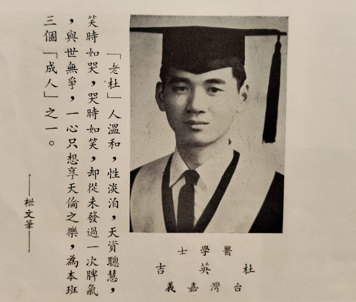 在家中十個兄弟姊妹中,杜英吉排行老二。國小六年級時,弟弟高燒不止,意識不清,家人四處借錢求醫。「後來回想,應該是腦膜炎。」看到弟弟因病而苦,加上那時得這種病的人很多,他在幼小的心靈早早立定志向:「以後有機會當醫生的話,我一定要救這些人。」